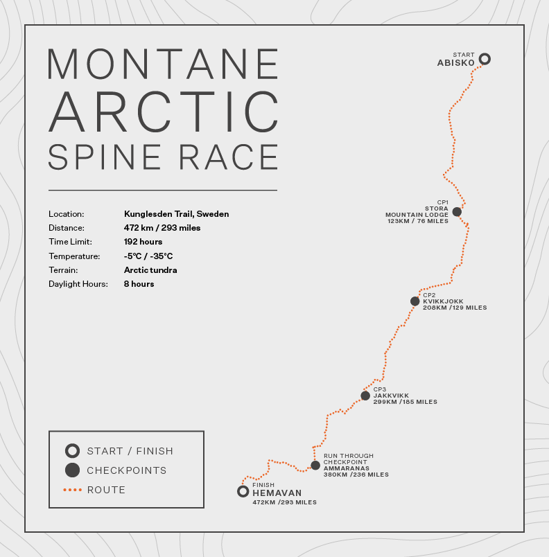 The Montane Arctic Spine Race takes place along the Kungsleden Trail in Arctic Sweden. A non-stop, 293 mile (472 km) foot race, with one of the most stunning winter landscapes in the world.