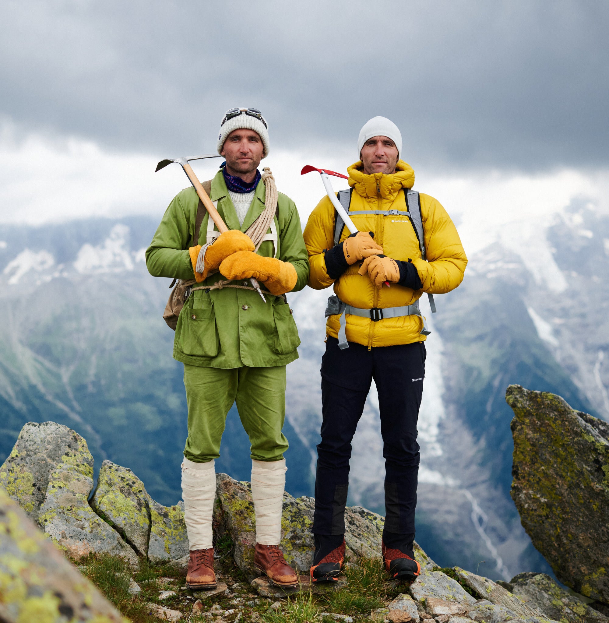 In true Turner style, the twins will split their approach: one will wear historically accurate clothing from the 1920s, while the other uses modern day high-performance gear. This includes vintage and bespoke items for the “Mallory & Irvine” twin such as original WW1 army clothing, tailored wool jackets and shirts from Devold, and even a meticulously recreated pair of boots by Crockett & Jones, modeled directly on the Mallory boot held at the Royal Geographical Society in London.