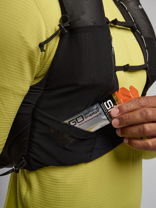 Multiple easy access harness pockets for food, hydration and essential kit and Side wand pockets