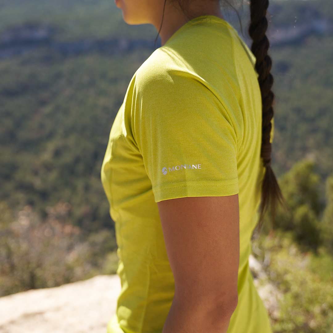 The lightweight, breathable APEX Polyester fabric used in the Montane Women’s Dart T-Shirt is entirely recycled from plastic bottles. This reduces our reliance on virgin resources because virgin polyester is oil based, while the fabric itself has been designed to deliver the perfect balance of warmth, wicking and breathability. (You can read more about this in the Know What You Are Buying details at the top of this page.) The dual-layer pique construction dries incredibly quickly and is stain-resistant making it ideal for fast-paced activities in the mountains.